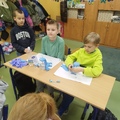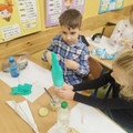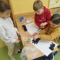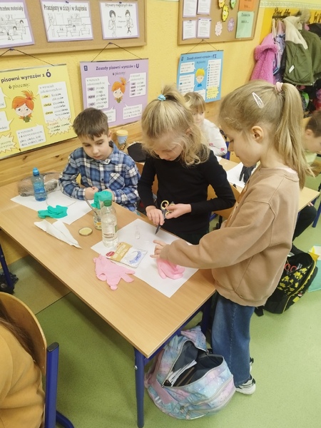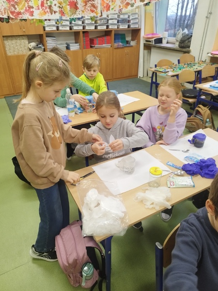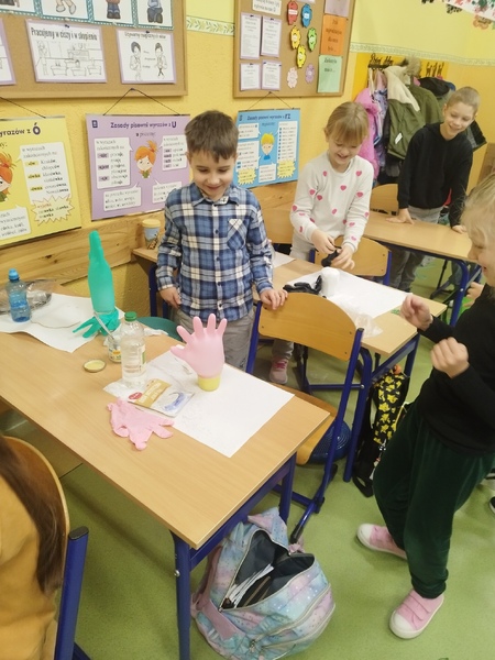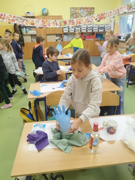 Uczniowie klasy 2c na kółku przyrodniczym mieli okazję przeprowadzić eksperyment „Żywa rękawica”. Do doświadczenia wykorzystali: szklankę, lateksową rękawiczkę, sodę oczyszczoną oraz ocet. Po połączeniu tych składników zaszła reakcja chemiczna, którą dzieci z dużym zaciekawieniem obserwowały. Dowiedziały się, że w jej wyniku powstaje dwutlenek węgla, który powoduje napompowanie rękawiczki.