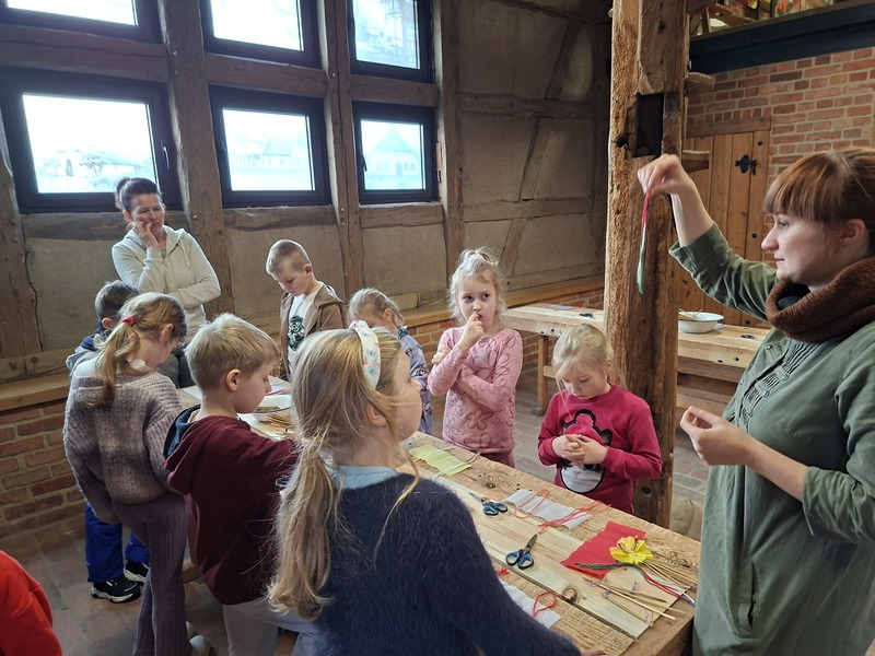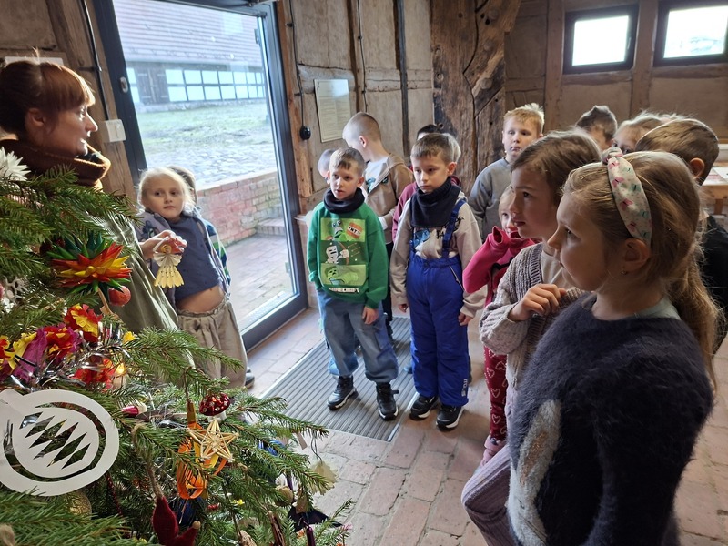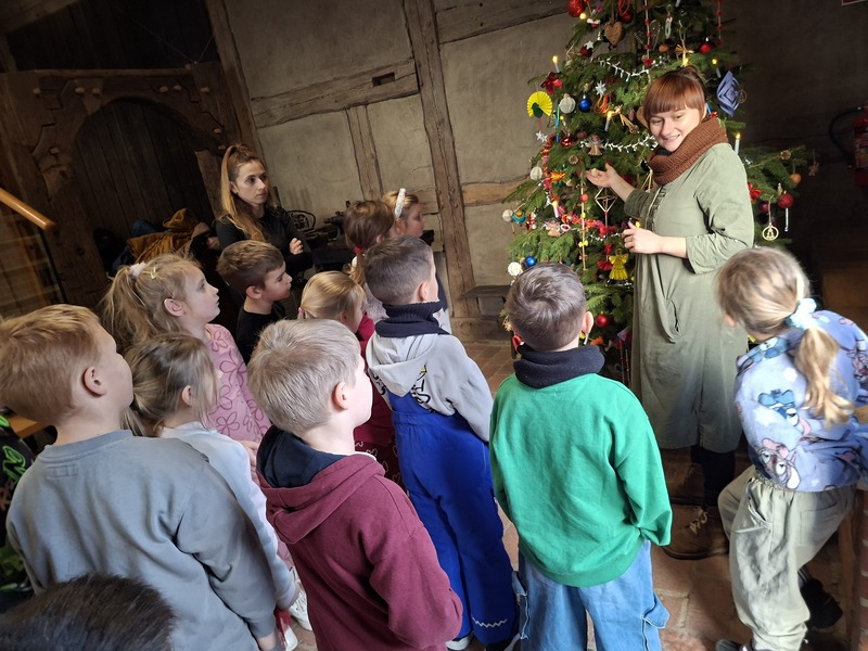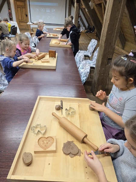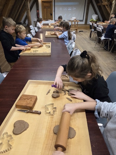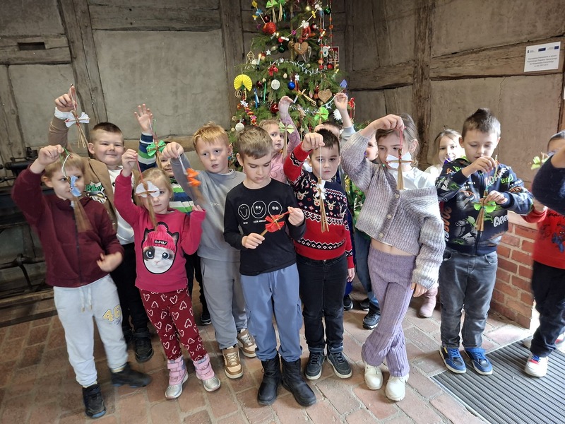 17 grudnia 2025r., uczniowie klas 1C i 1D wzięli udział w warsztatach świątecznych w Muzeum Kultury Ludowej Pomorza w Swołowie. Poznali dawne tradycje i zwyczaje bożonarodzeniowe na Pomorzu. Dzieci uczestniczyły w zajęciach kulinarnych, przygotowując pierniki. Poznały obrzędy i symbolikę piernika kaszubskiego. Uczestniczyły także w zajęciach plastycznych, na których wykonały słomkowego anioła. Warsztaty odbyły się w życzliwej i świątecznej atmosferze.