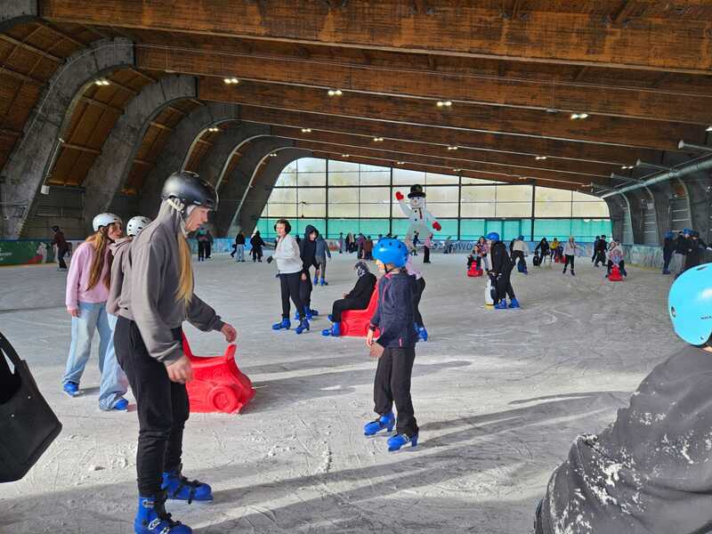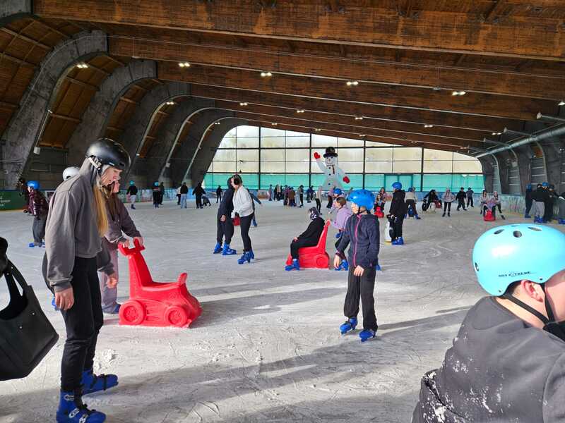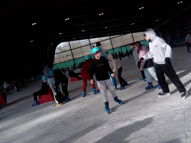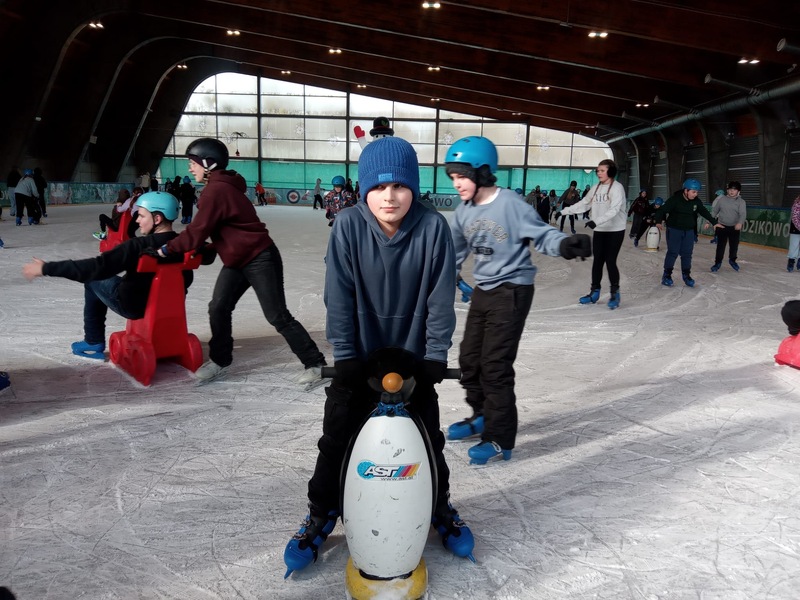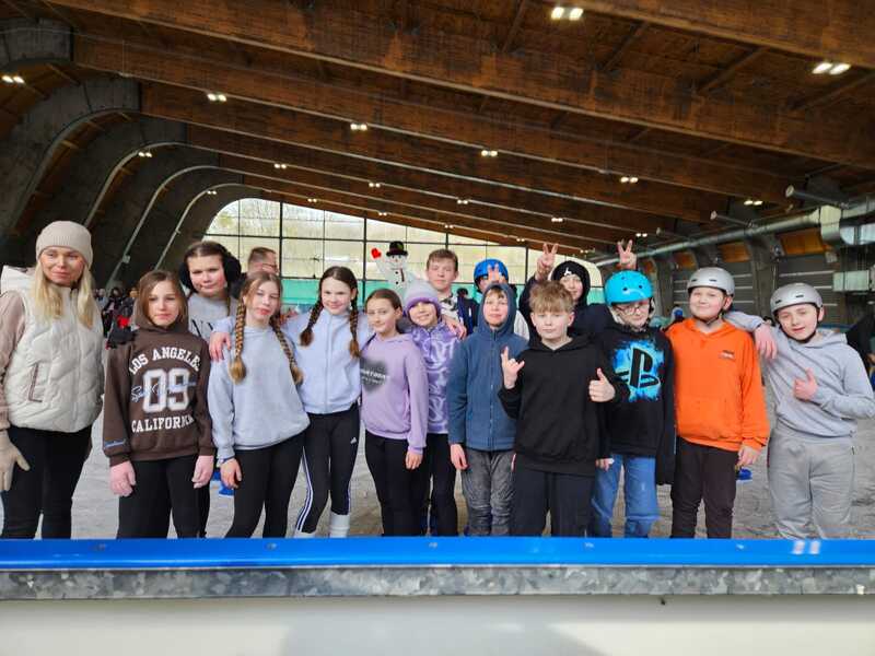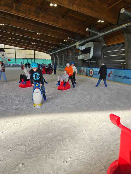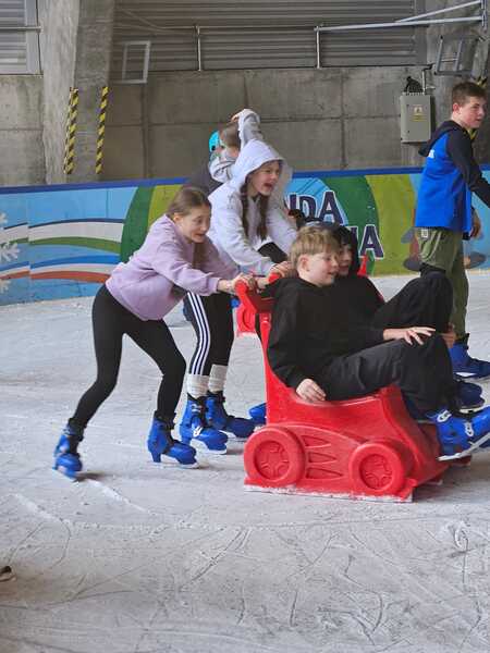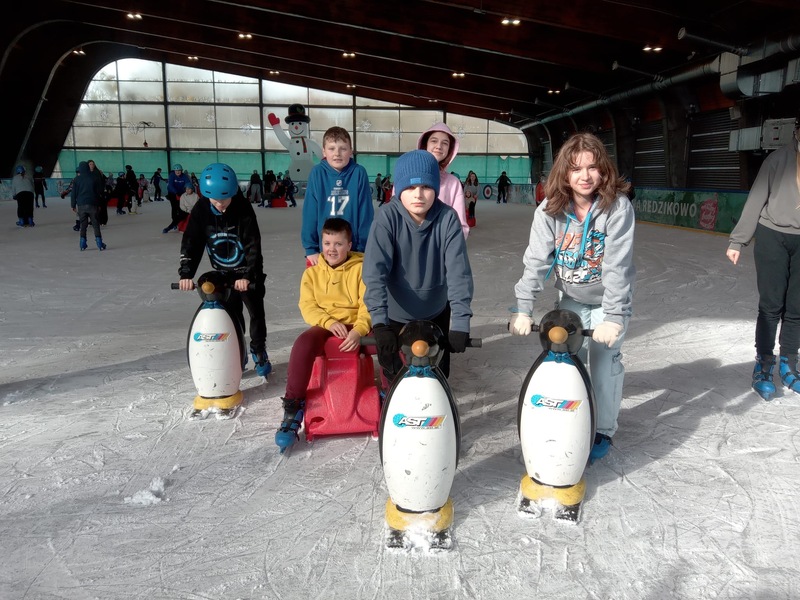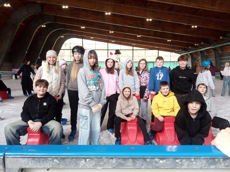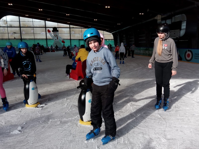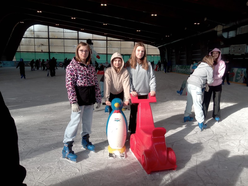 W piątek, 27.02.2026 r. uczniowie klasy V d i V e pod opieką Pani Dyrektor - Joanny Koguciuk, wychowawczyni klasy V d - Pani Haliny Bajor oraz wychowawczyni klasy V e – Pani Marzeny Kolanek udali się na wycieczkę na lodowisko do Redzikowa pod Słupskiem, by doskonalić swoje umiejętności łyżwiarskie i aktywnie spędzić czas.