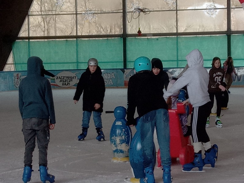 Zajęcia na lodowisku stanowiły nie lada atrakcję, uczniowie chętnie w nich uczestniczyli. Sprawiły one wiele radości nawet tym, którzy pierwszy raz stanęli na tafli lodowiska. Mogliśmy obserwować wzloty i nieliczne upadki naszych uczniów, ale także podziwiać kunszt zaawansowanych łyżwiarzy. Wyjazd na łyżwy był przede wszystkim zachętą do aktywnego spędzania czasu wolnego, integracją zespołów i radosnym zakończeniem długiej zimy. Za rok też się tam wybierzemy!