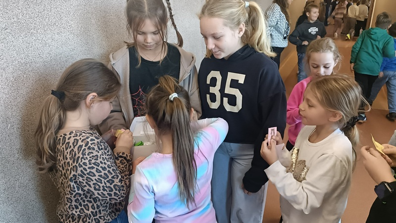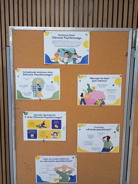 W budynku na ul. Szkolnej 12 na głównym korytarzu w szkole umieszczono gazetkę o zdrowiu psychicznym. Mogliśmy się z niej dowiedzieć jak dbać o zdrowie psychiczne i gdzie szukać pomocy, gdy jest trudno. Tego dnia uczennice rozdawały uczniom i nauczycielom „pozytywne myśli”, które sprawiły uśmiech wśród naszej społeczności i wiarę w swojej możliwości.