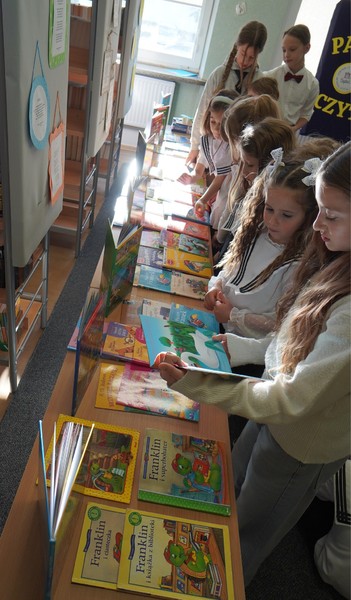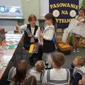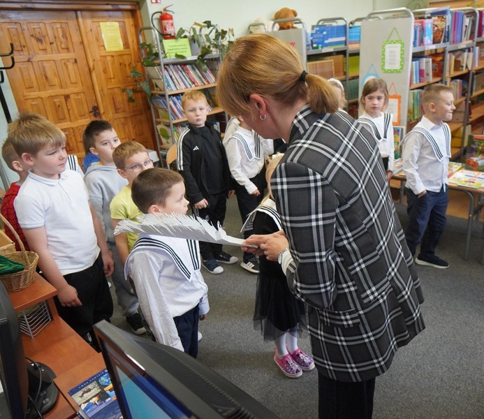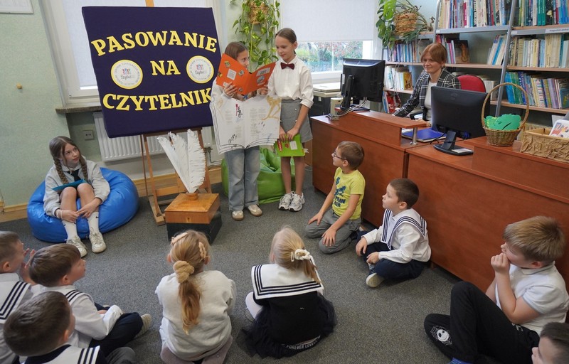 W dniach 17 – 20 listopada br. 83 pierwszoklasistów przyjętych zostało w poczet czytelników biblioteki szkolnej. W świat książek najmłodszych uczniów wprowadziły koleżanki z klasy VE. Nie obyło się również bez zagadek związanych z bajkami i baśniami. Następnie w obecności Pani Wicedyrektor Justyny Tomczyk i Wychowawców uczniowie przyrzekli, że będą szanować książki i korzystać z ich mądrości oraz sumiennie wypełniać obowiązki czytelnika. Każde dziecko zostało uroczyście pasowane symbolicznym piórem, stając się czytelnikiem biblioteki szkolnej. Na pamiątkę uczniowie otrzymali certyfikat złożonego przyrzeczenia i zakładkę do książki.