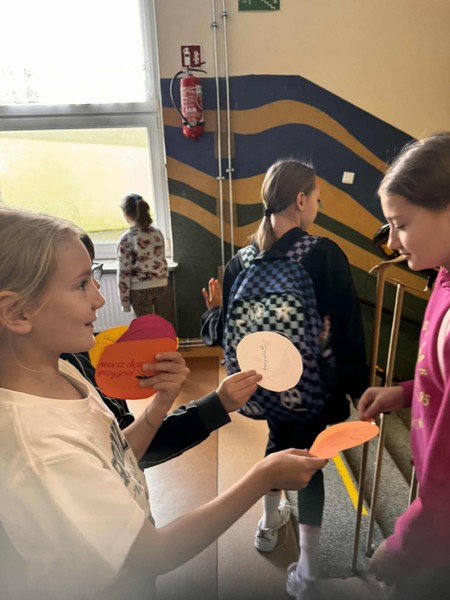 Nasi wolontariusze ze szkolnego klubu wolontariusza „Pomocna Dłoń” przez cały dzień rozdawali kolorowe karteczki z ciepłymi słowami, inspirującymi sentencjami i drobnymi pozdrowieniami. Na twarzach uczniów i nauczycieli nie brakowało uśmiechów, a w korytarzach panowała wyjątkowo serdeczna i pozytywna atmosfera.