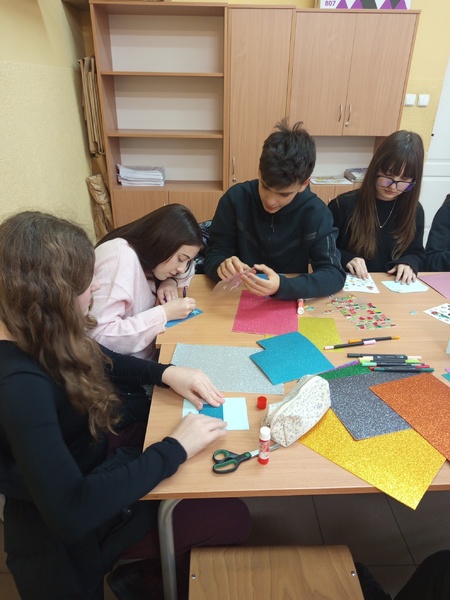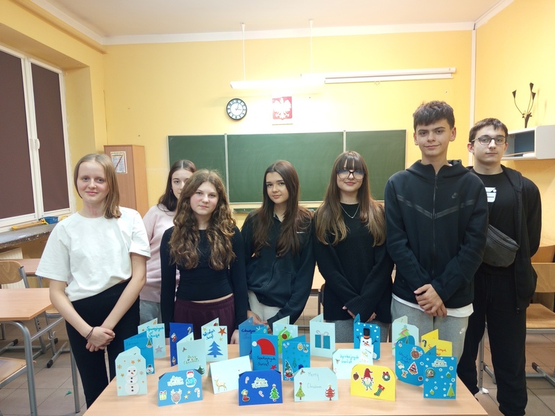Dnia 09 grudnia 2025 roku wolontariusze ze Szkolnego Klubu Wolontariusza „Pomocna dłoń” przygotowali kartki świąteczne, które zostaną przekazane dla pensjonariuszy hospicjum.