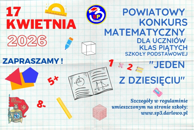 Szkoła Podstawowa nr 3 w Darłowie, zaprasza do udziału w Powiatowym Konkursie Matematycznym dla uczniów klas piątych „Jeden z dziesięciu” pod patronatem Starosty Powiatu Sławieńskiego i Burmistrza Miasta Darłowo.