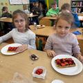 Dzieci z radością przygotowywały swoje porcje, a wspólne jedzenie było okazją do integracji i miłej rozmowy. Uczniowie przekonali się, że owoce są doskonałym dodatkiem do deserów.