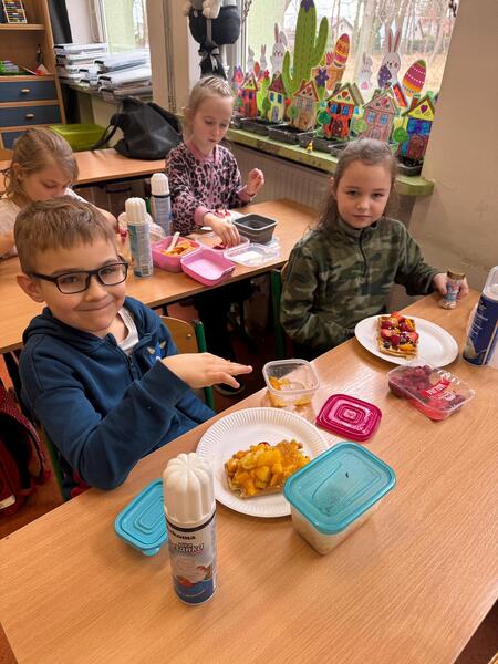 Uczniowie przynieśli z domu różnorodne owoce, takie jak truskawki, banany, borówki czy kiwi. Dzięki temu każdy mógł samodzielnie udekorować swojego gofra według własnego pomysłu. Kolorowe owoce sprawiły, że gofry wyglądały bardzo apetycznie i jednocześnie były pełne witamin.
