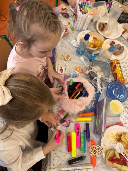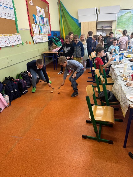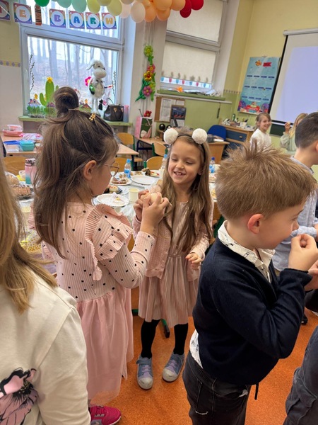 Po świątecznym śniadaniu czas na zabawę. Dużą radość sprawiło dzieciom malowanie jajek, podczas którego mogły wykazać się kreatywnością i wyobraźnią. Następnie odbył się wesoły bieg z jajkami na łyżkach, który dostarczył wszystkim dużo śmiechu i emocji, nie zabrakło turlania jajek na czas. Na zakończenie zorganizowano tradycyjną „bitwę na jajka”, czyli zabawę polegającą na stukaniu się pisankami.