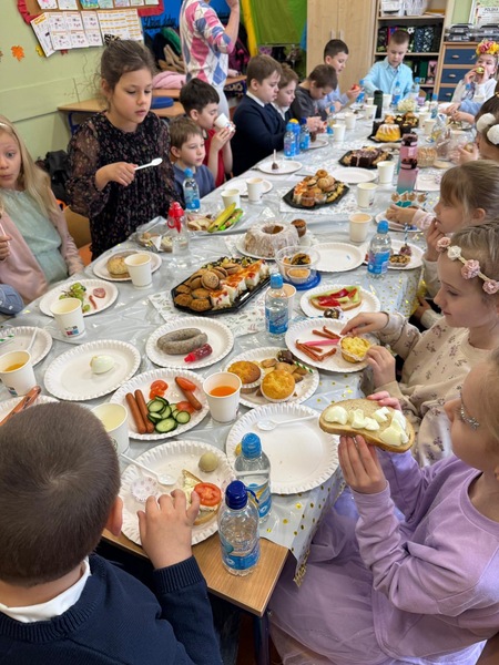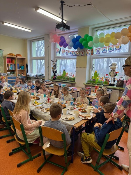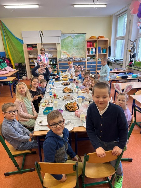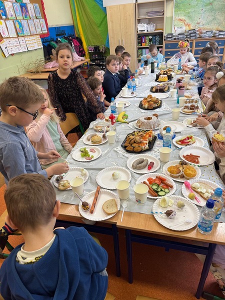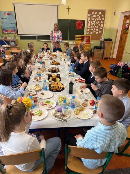 Tuż przed przerwą świąteczną w naszej klasie odbyło się śniadanie wielkanocne. Na stołach pojawiły się tradycyjne potrawy takie jak babka wielkanocna, mazurek, biała kiełbasa oraz pyszna sałatka warzywna. Dodatkowo uczniowie przygotowali pyszne, zdrowe kanapki wiosenne.