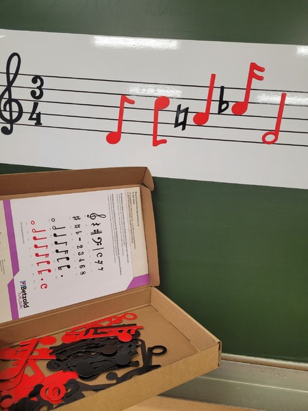 - dwie magnetyczne pięciolinie z zestawami nut samoprzylepnych,