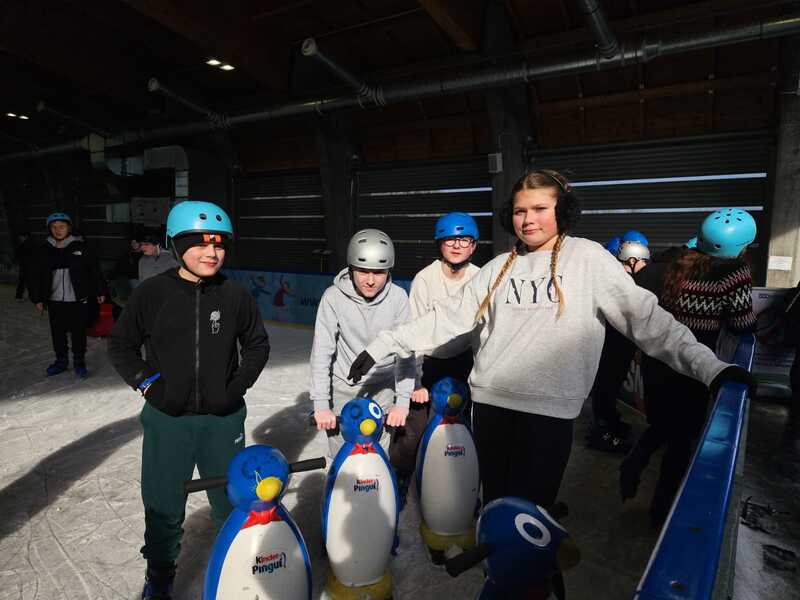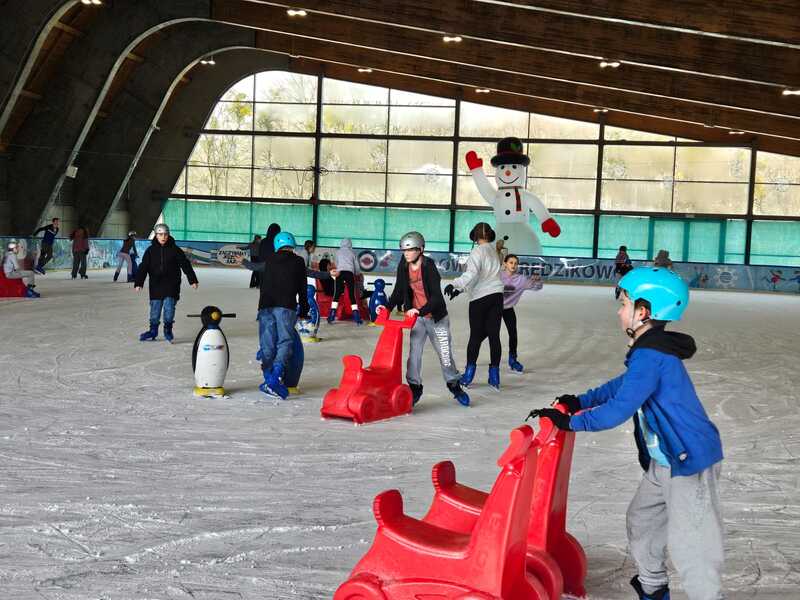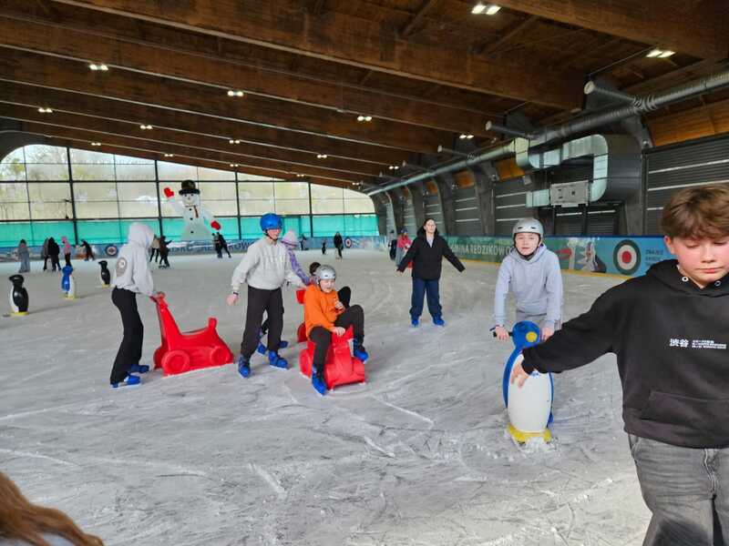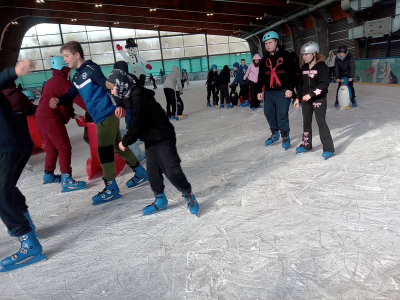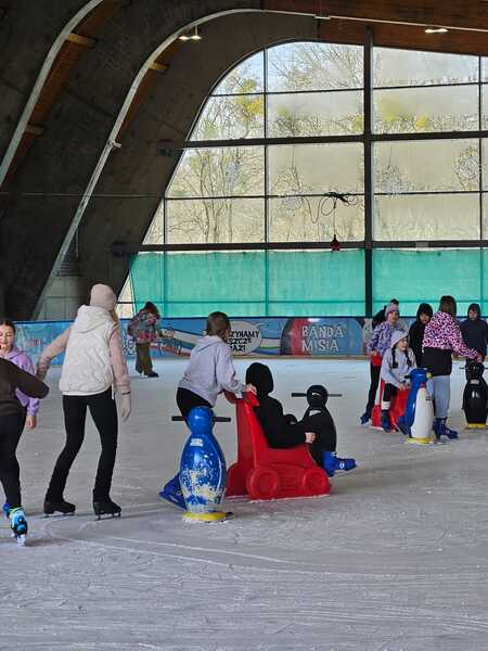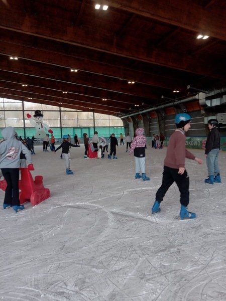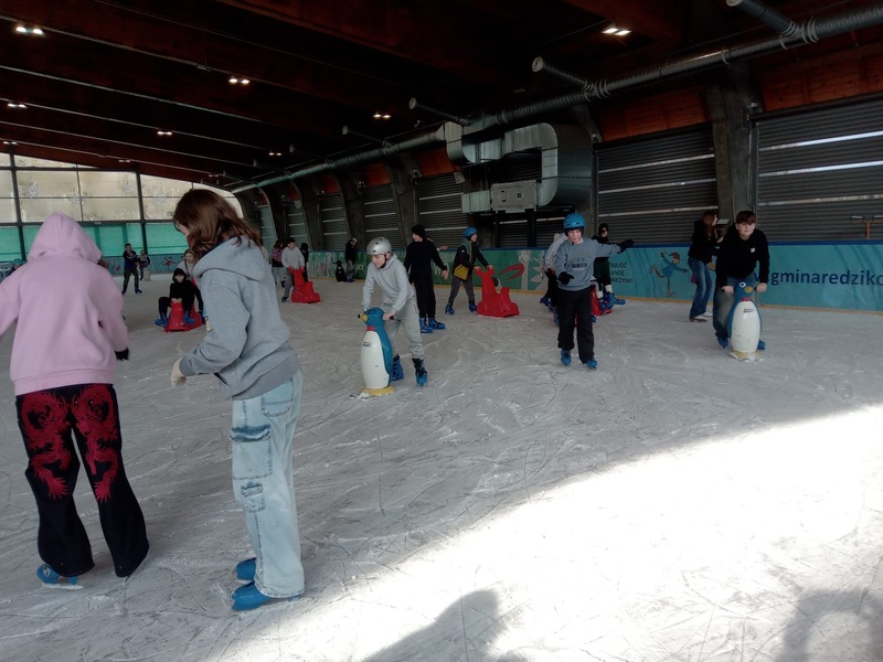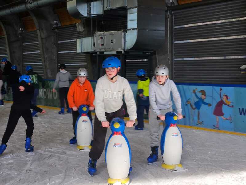 W piątek, 27.02.2026 r. uczniowie klasy V d i V e pod opieką Pani Dyrektor - Joanny Koguciuk, wychowawczyni klasy V d - Pani Haliny Bajor oraz wychowawczyni klasy V e – Pani Marzeny Kolanek udali się na wycieczkę na lodowisko do Redzikowa pod Słupskiem, by doskonalić swoje umiejętności łyżwiarskie i aktywnie spędzić czas.