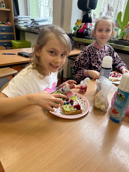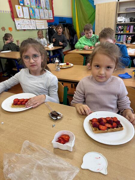 Uczniowie przynieśli z domu różnorodne owoce, takie jak truskawki, banany, borówki czy kiwi. Dzięki temu każdy mógł samodzielnie udekorować swojego gofra według własnego pomysłu. Kolorowe owoce sprawiły, że gofry wyglądały bardzo apetycznie i jednocześnie były pełne witamin.