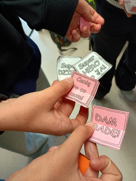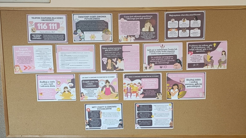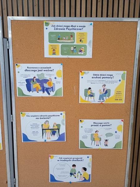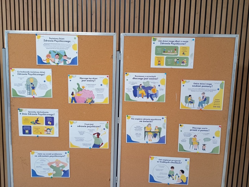 W budynku na ul. Szkolnej 12 na głównym korytarzu w szkole umieszczono gazetkę o zdrowiu psychicznym. Mogliśmy się z niej dowiedzieć jak dbać o zdrowie psychiczne i gdzie szukać pomocy, gdy jest trudno. Tego dnia uczennice rozdawały uczniom i nauczycielom „pozytywne myśli”, które sprawiły uśmiech wśród naszej społeczności i wiarę w swojej możliwości.