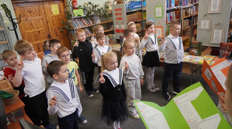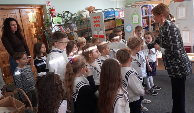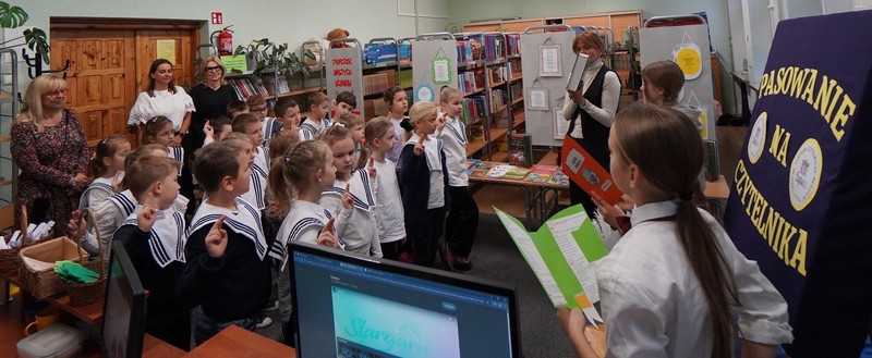 W dniach 17 – 20 listopada br. 83 pierwszoklasistów przyjętych zostało w poczet czytelników biblioteki szkolnej. W świat książek najmłodszych uczniów wprowadziły koleżanki z klasy VE. Nie obyło się również bez zagadek związanych z bajkami i baśniami. Następnie w obecności Pani Wicedyrektor Justyny Tomczyk i Wychowawców uczniowie przyrzekli, że będą szanować książki i korzystać z ich mądrości oraz sumiennie wypełniać obowiązki czytelnika. Każde dziecko zostało uroczyście pasowane symbolicznym piórem, stając się czytelnikiem biblioteki szkolnej. Na pamiątkę uczniowie otrzymali certyfikat złożonego przyrzeczenia i zakładkę do książki.