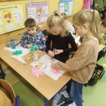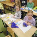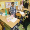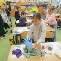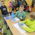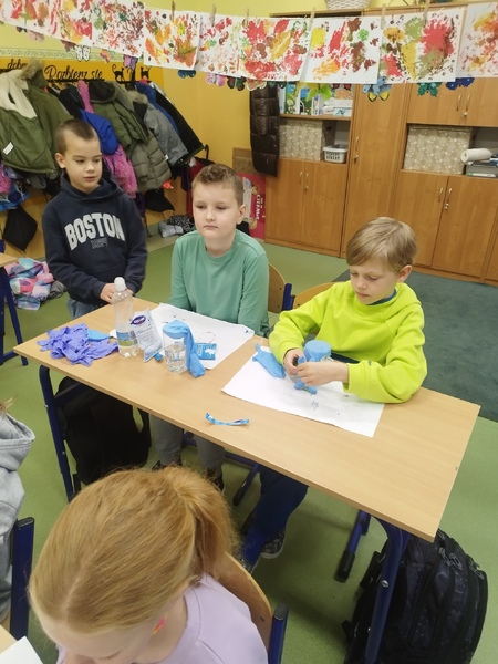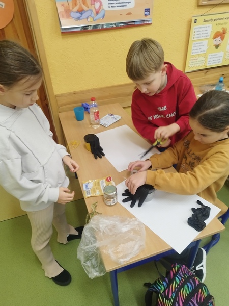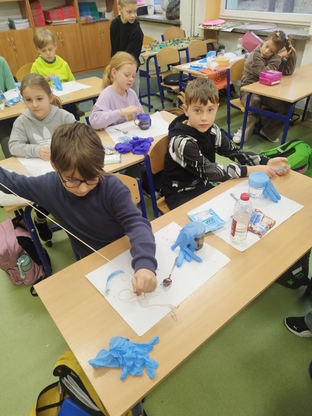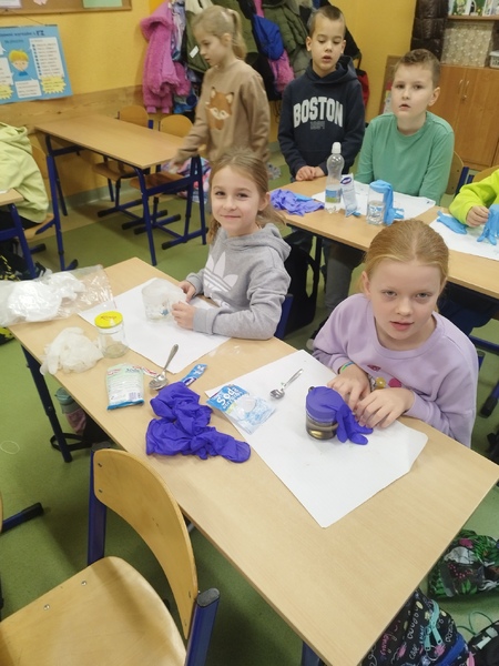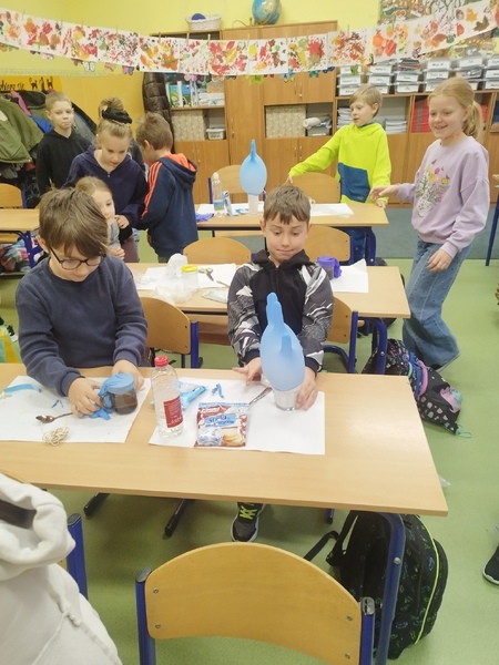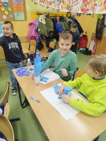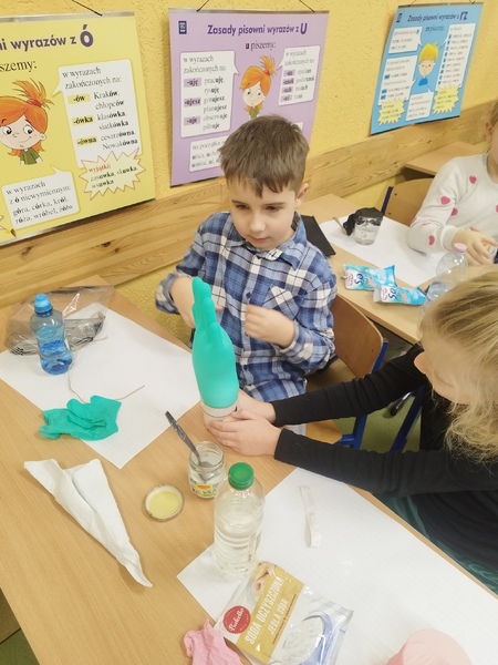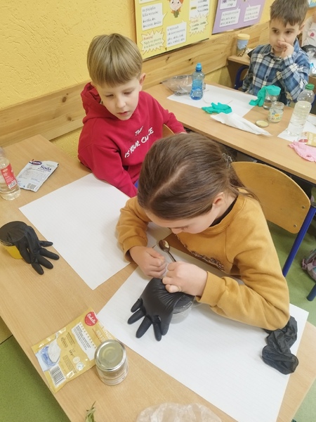 Uczniowie klasy 2c na kółku przyrodniczym mieli okazję przeprowadzić eksperyment „Żywa rękawica”. Do doświadczenia wykorzystali: szklankę, lateksową rękawiczkę, sodę oczyszczoną oraz ocet. Po połączeniu tych składników zaszła reakcja chemiczna, którą dzieci z dużym zaciekawieniem obserwowały. Dowiedziały się, że w jej wyniku powstaje dwutlenek węgla, który powoduje napompowanie rękawiczki.