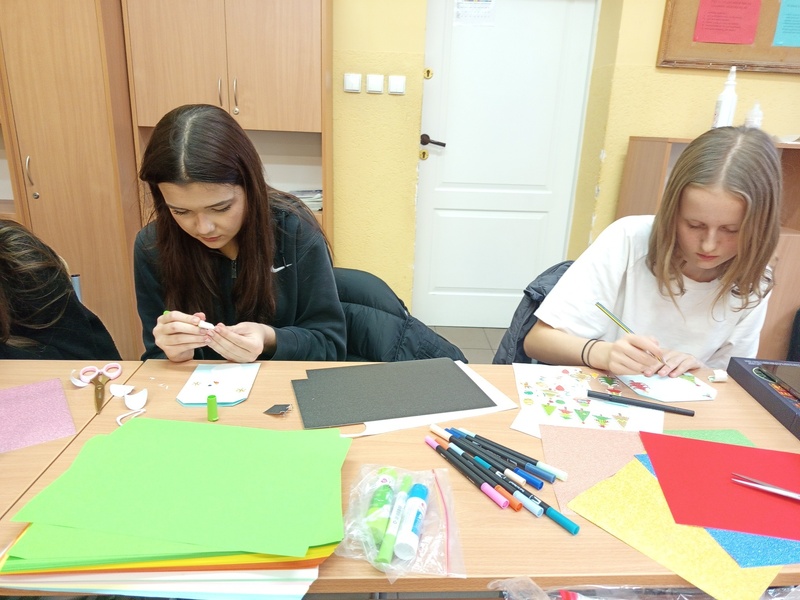 Dnia 09 grudnia 2025 roku wolontariusze ze Szkolnego Klubu Wolontariusza „Pomocna dłoń” przygotowali kartki świąteczne, które zostaną przekazane dla pensjonariuszy hospicjum.