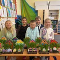 Żegnając się uczniowie zabrali do domu swoją hodowlę owsa, udekorowaną kolorowymi pisankami.
