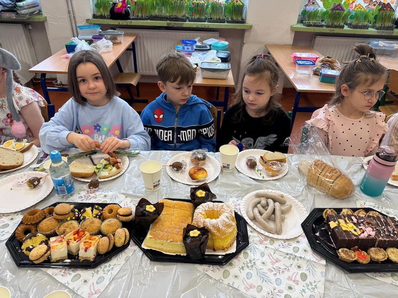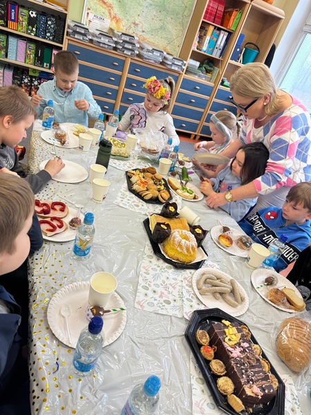 Tuż przed przerwą świąteczną w naszej klasie odbyło się śniadanie wielkanocne. Na stołach pojawiły się tradycyjne potrawy takie jak babka wielkanocna, mazurek, biała kiełbasa oraz pyszna sałatka warzywna. Dodatkowo uczniowie przygotowali pyszne, zdrowe kanapki wiosenne.