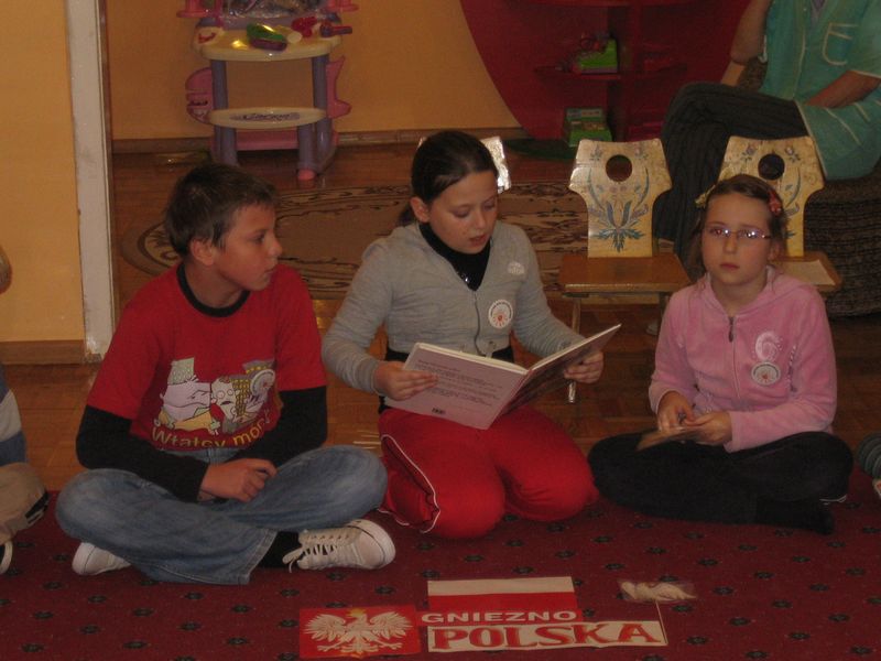 Nikola Jacyszyn czytali dzieciom legendę „O Lechu, Czechu i Rusie”. Po